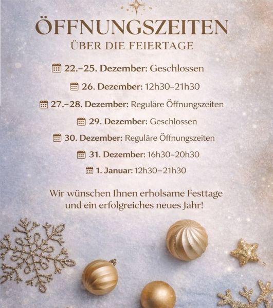 Montag RuhetagDi. - Fr.: 11.30 - 14.30 & 17.00 - 21.30Sa. & So.: 16.30 - 21.30Die reguläre Öffnungszeiten können am Feiertagen abweichen